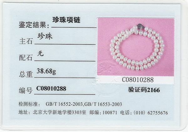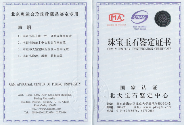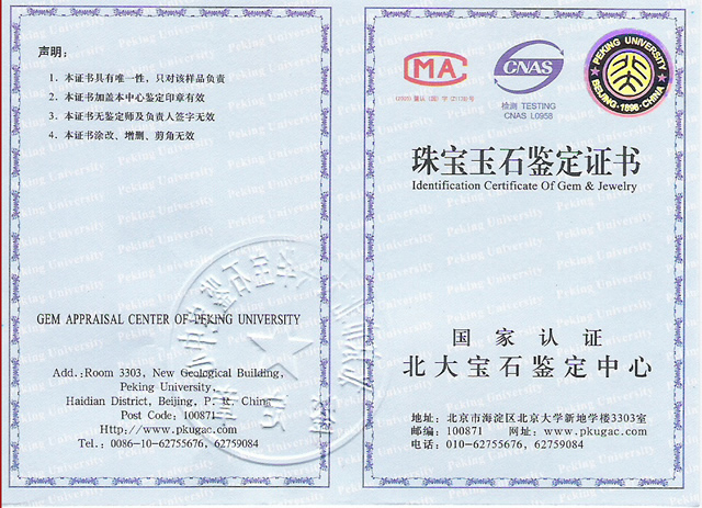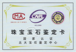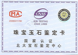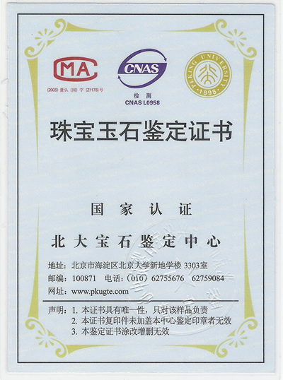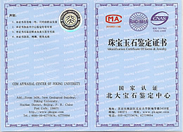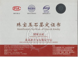 珠宝玉石鉴定证书(正面) | 珠宝玉石鉴定证书(反面) |