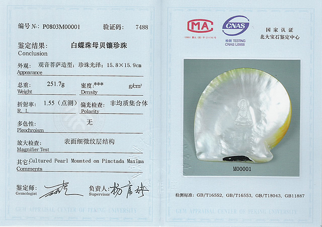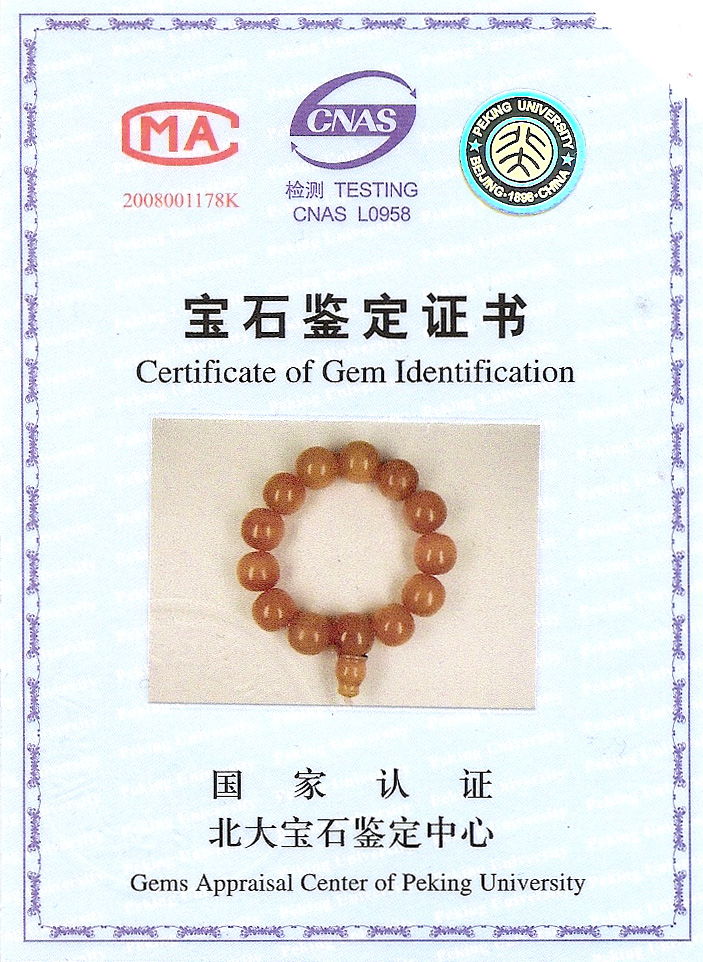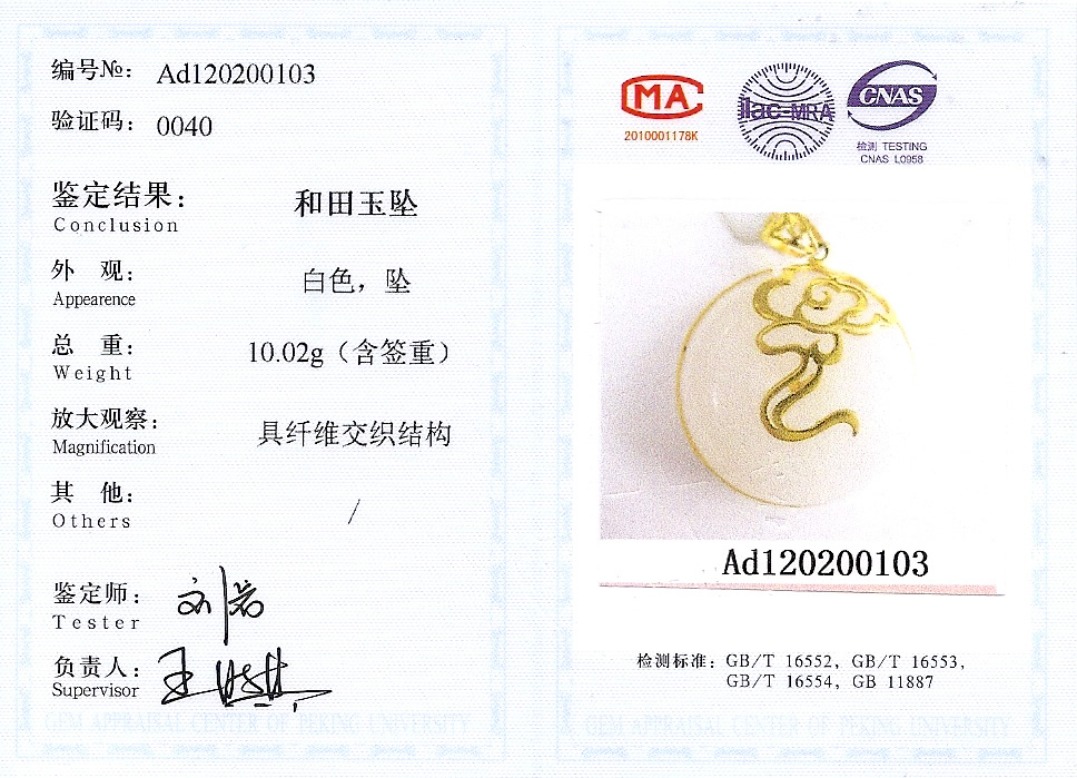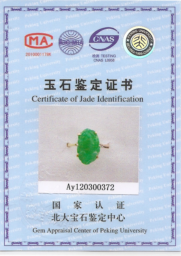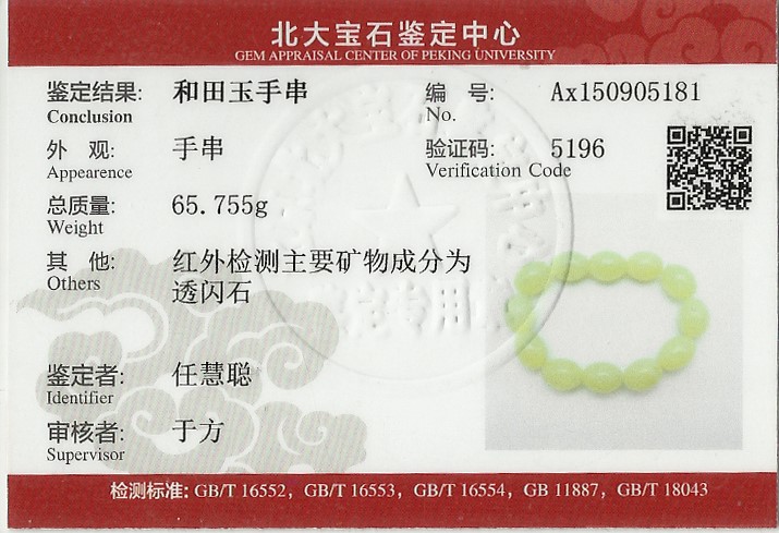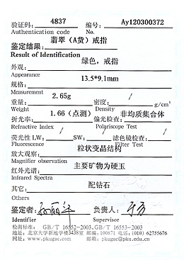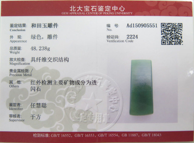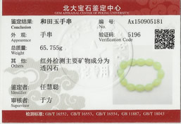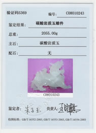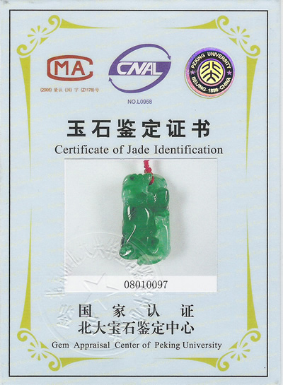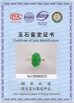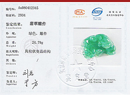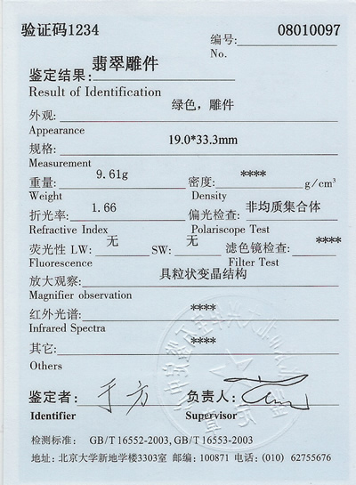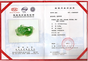 玉石鉴定证书(正面) | 玉石鉴定证书(反面) |