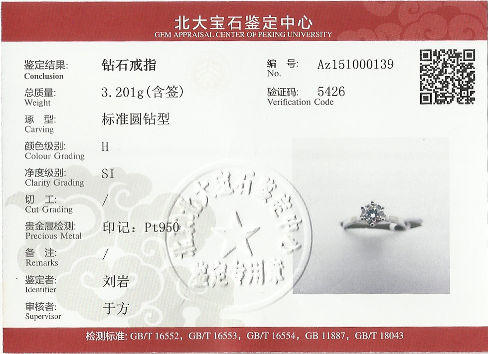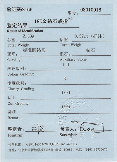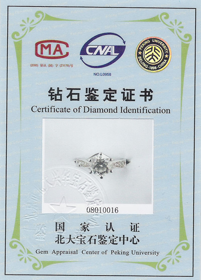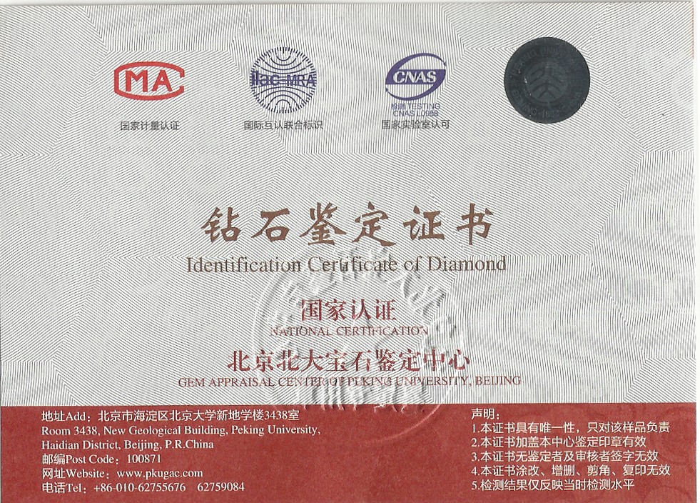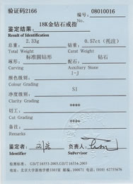 钻石鉴定证书(正面) | 钻石鉴定证书(反面) |