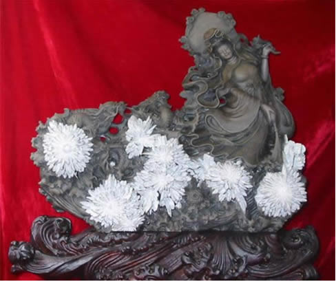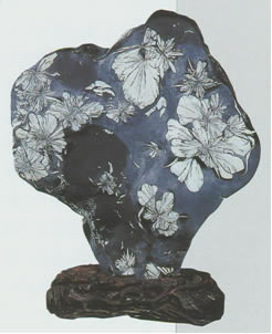 菊花石是生长在早二迭世下部地层中的一种天然岩石。它是由天然的天青石(SrSO2)或异质同象的方解石(CaCO3)矿物构成花瓣,花瓣呈放射状对称分布组成白色花朵;花瓣中心由近似圆形的黑色燧石(SiO2)构成花蕊,活似天工制做之怒放盛开的菊花,故名菊花石。菊花石周围的基质岩石为灰岩或硅质砾石灰岩,灰岩中偶尔含有蜓类、蜿足类汉珊瑚化石,给菊花石增添了生命活力。菊花花瓣为多层状,具立体感。花朵大小不一,最大者直径