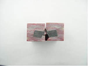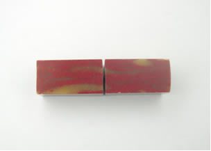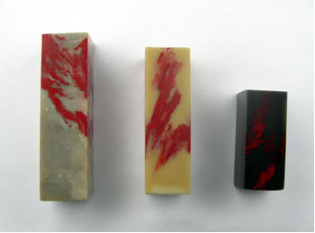 这种鸡血石造假方法是用岩粉伴胶水用高压法制成。血的材料是用大红油漆,地子的材料五花八门,经鉴定有绿泥石、滑石、萤石、碳酸盐、石盐等。鸡血石章整体组构仿制的很像,血的分布显得有表里、有层次、有聚散、有条状、有团块状、有星点状、比较自然,地子的分布形态也比较自然,微透明,有些加上少量石英小颗粒,仿鸡血石的“钉”,有些还撒上一些细粒的黄铁矿,仿真天然。