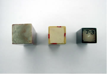 假货一般都具有较小的密度,测了一些数据为1.82.2g/cm3,用手掂一般可以感觉出来。但有时也遇到密度明显大的假货,测其数据竟达到2.96g/cm3,切开后才知中间夹藏了金属条。目的显然是掩人耳目,让你不起疑心。
