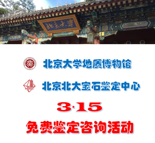 为迎接“3·15国际消费者权益日”,本着更好的服务于消费者的宗旨,让更多的消费者了解珠宝、认识珠宝,北京大学地质博物馆和北京北大宝石鉴定中心将于当天举办免费珠宝玉石鉴定咨询活动,欢迎广大消费者踊跃参加。活动地点及时间安排: 地点:北京市海淀区北京大学逸夫二楼一层大厅 咨询电话:010-62755676 时间:2018年3月15日9:00至16:00 免费鉴定活动每人限5件,活动解释权归主办方所有。