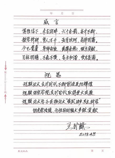 在北京大学建校120周年校庆来临之际,我们怀着无比激动的心情来到逸夫二楼王时麒老先生的办公室。轻轻地几声敲门声之后,办公室的门被一位慈祥的老人打开,他热情的招呼我们进屋坐下。屋内没有复杂的摆设,只是各类书籍堆满了书橱。头发花白但精神矍铄,这便是王老师给人的第一印象。当我们吃惊于王老师退休多年却仍坚持在工作岗位上时,已经超过80岁高龄地王老师说,多年来早已习惯每天十点睡觉五点半起床锻炼一小时后上班工作的生活,而自己也愿意在岗位上继续发点光发点热。