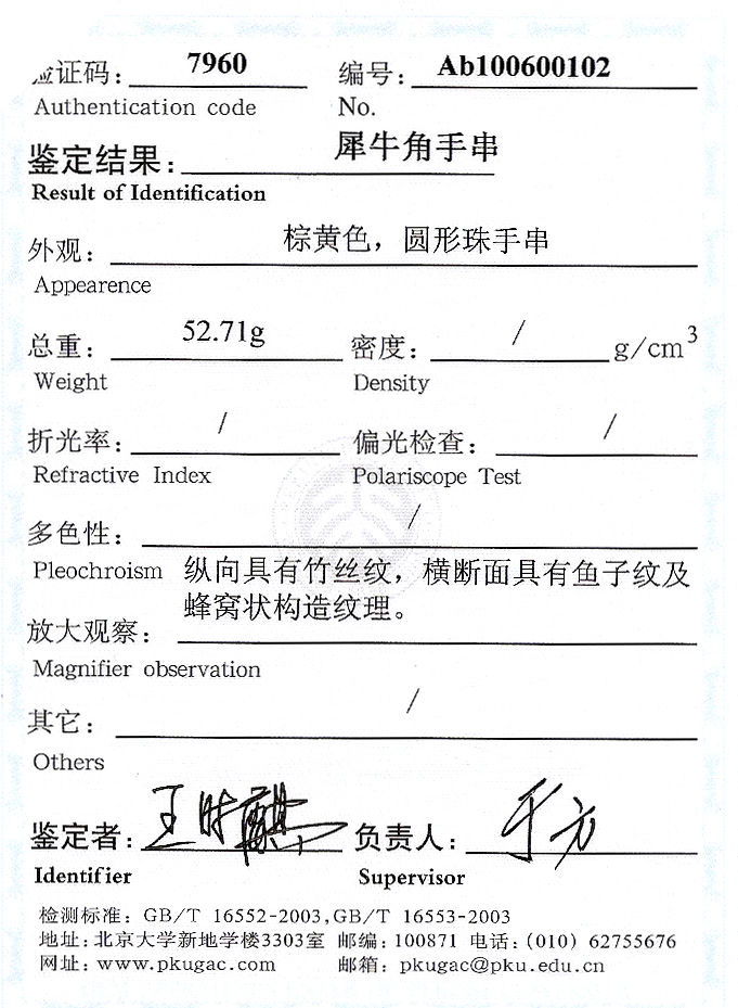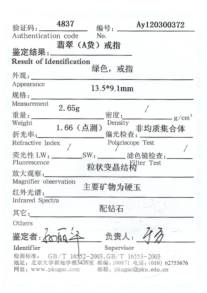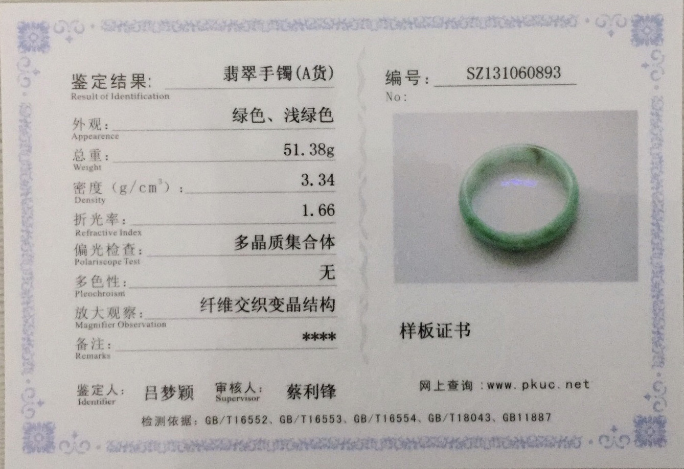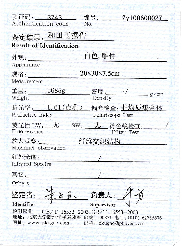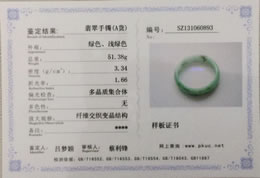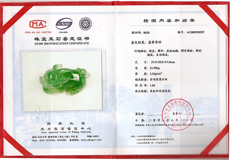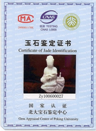玉石鉴定证书(正面) | 玉石鉴定证书(反面) |