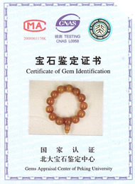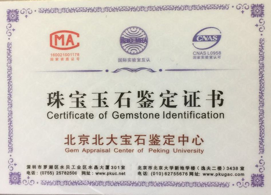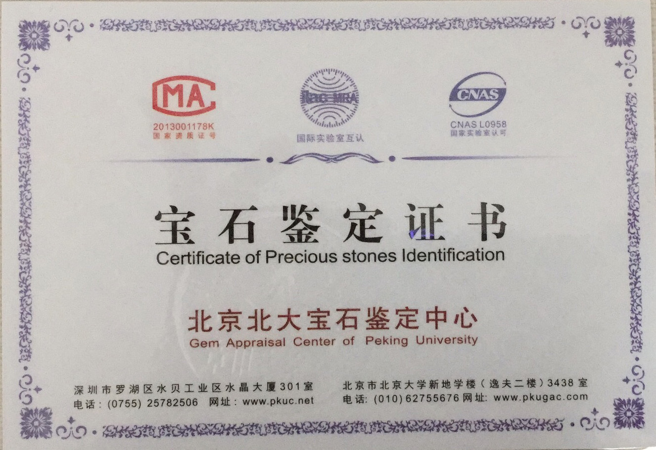 珠宝玉石鉴定证书(正面) | 珠宝玉石鉴定证书(反面) |